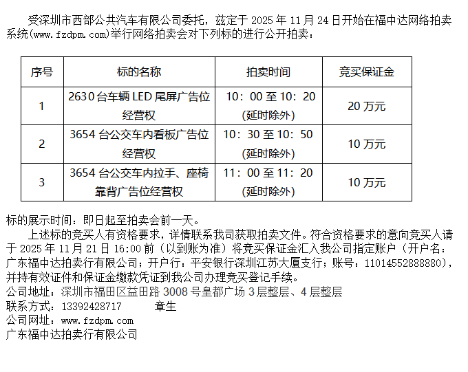 2、竞买人应在2025年11月21日16:00时前将竞买保证金10万元交至拍卖人,缴纳保证金的缴款账户名应与网络竞买人的姓名一致,拍卖人收到竞买保证金方能为竞买人办理竞买手续,否则视为不具有竞买资格。拍卖成交后,拍卖成交价款、佣金等相关税、费以转账交付至户名:广东福中达拍卖行有限公司,开户行:深圳市平安银行江苏大厦支行,账号:11014552888880。